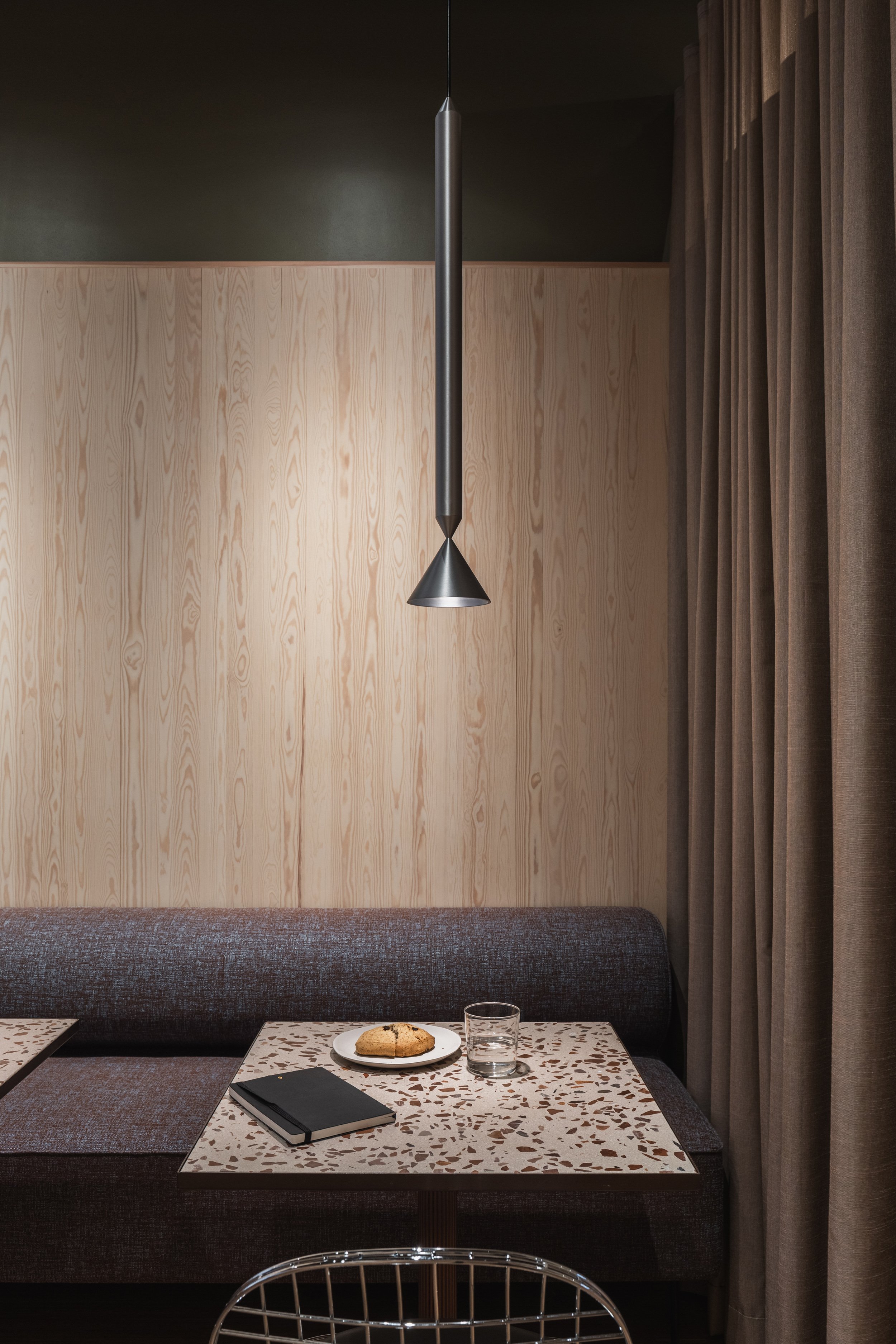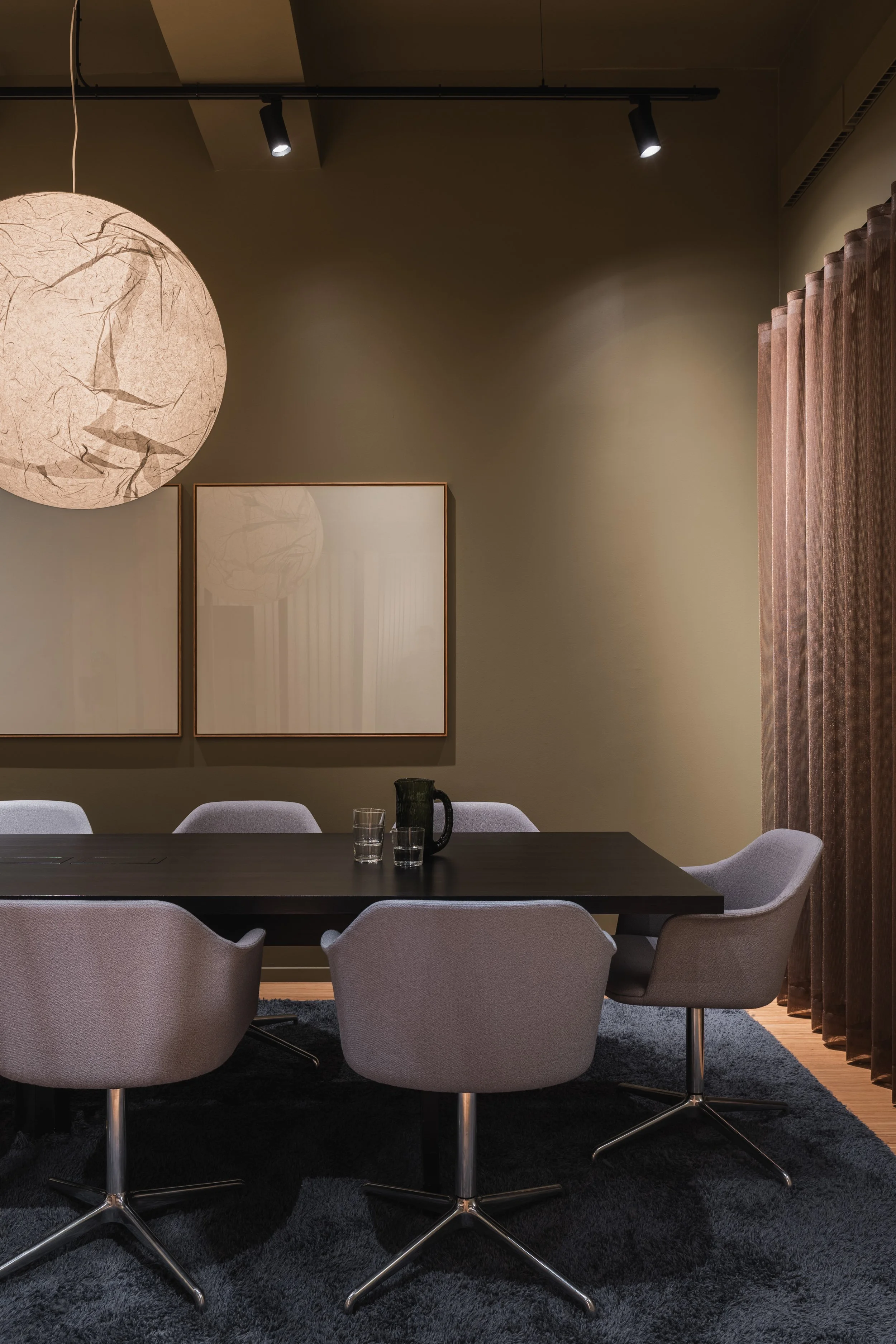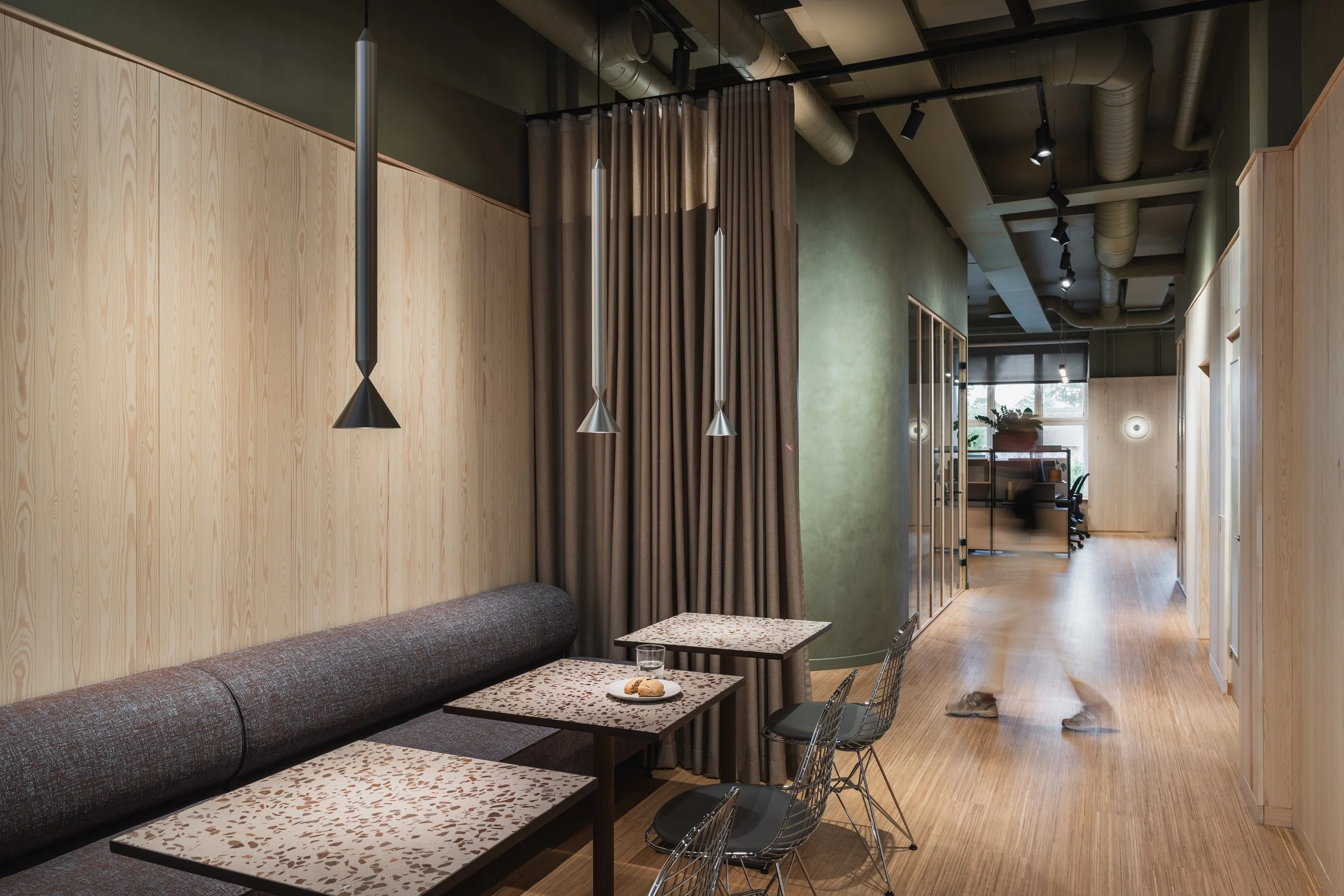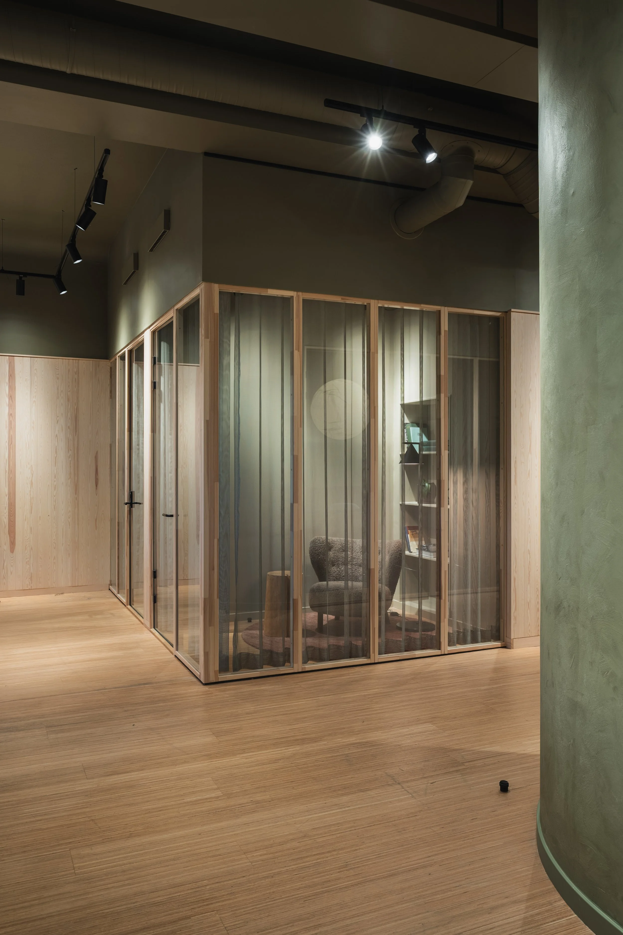 Skogen, styrerommet, er utformet med et skreddersydd eikebord, avrundede grønne flater og lun belysning som bidrar til en rolig og konsentrert atmosfære.