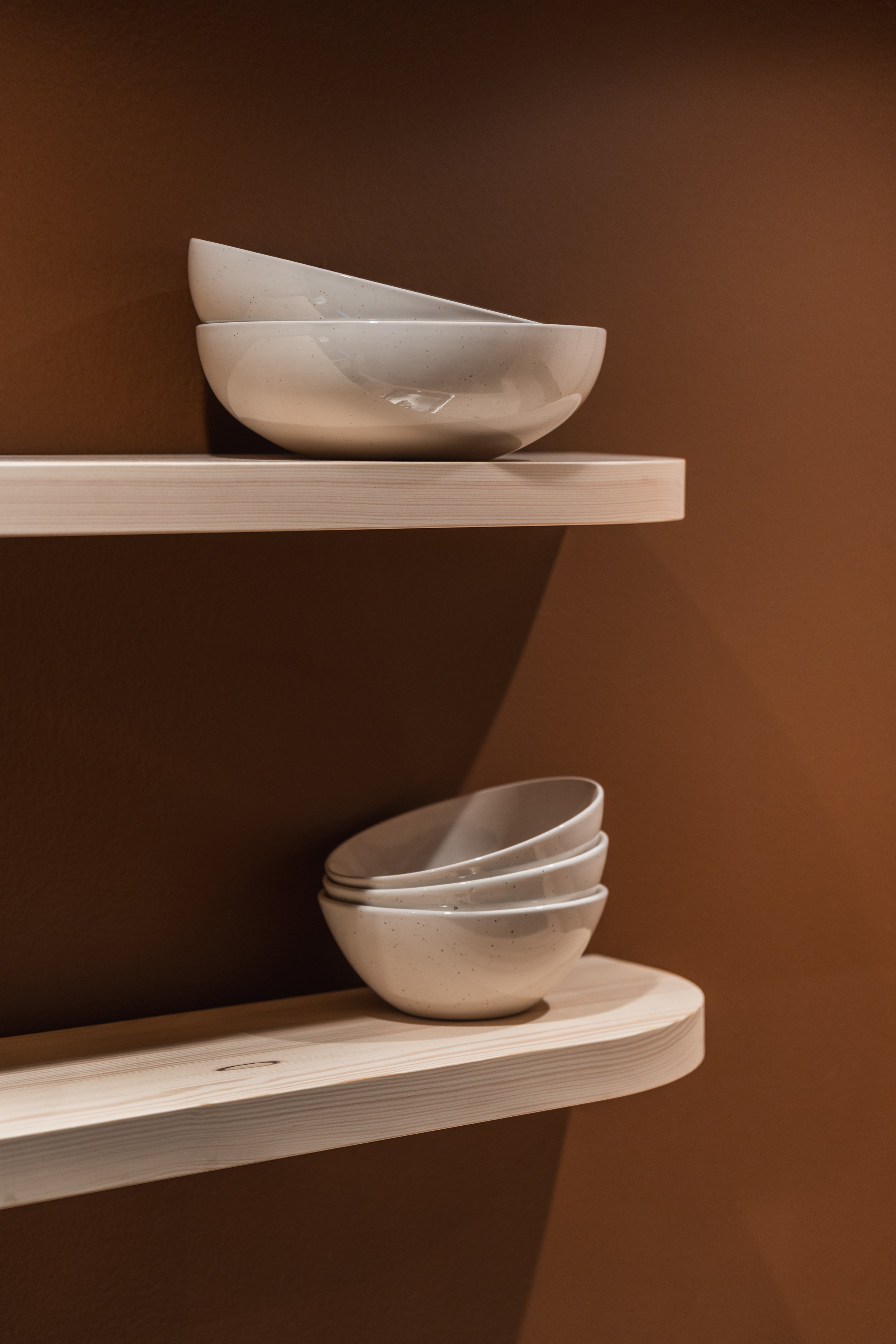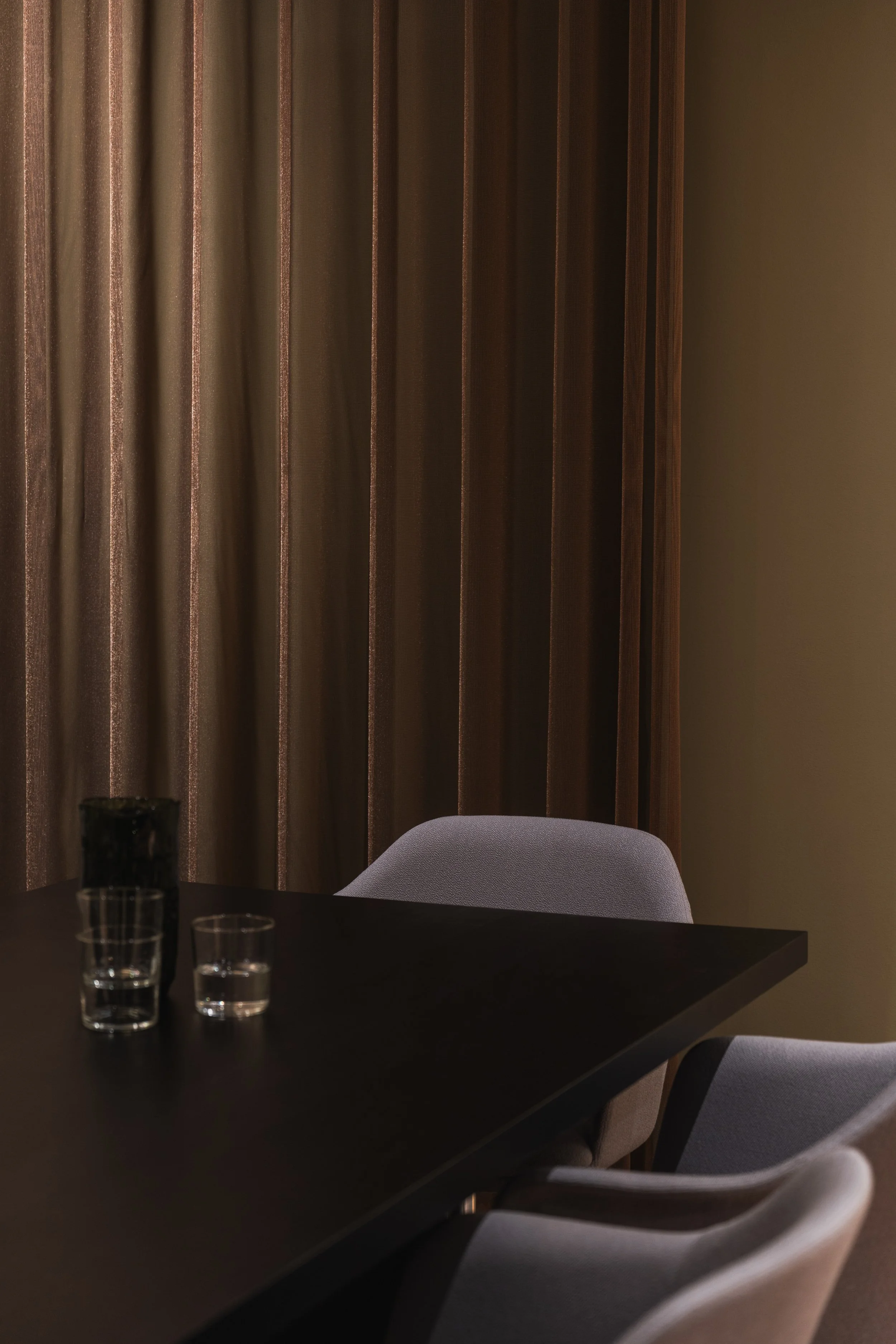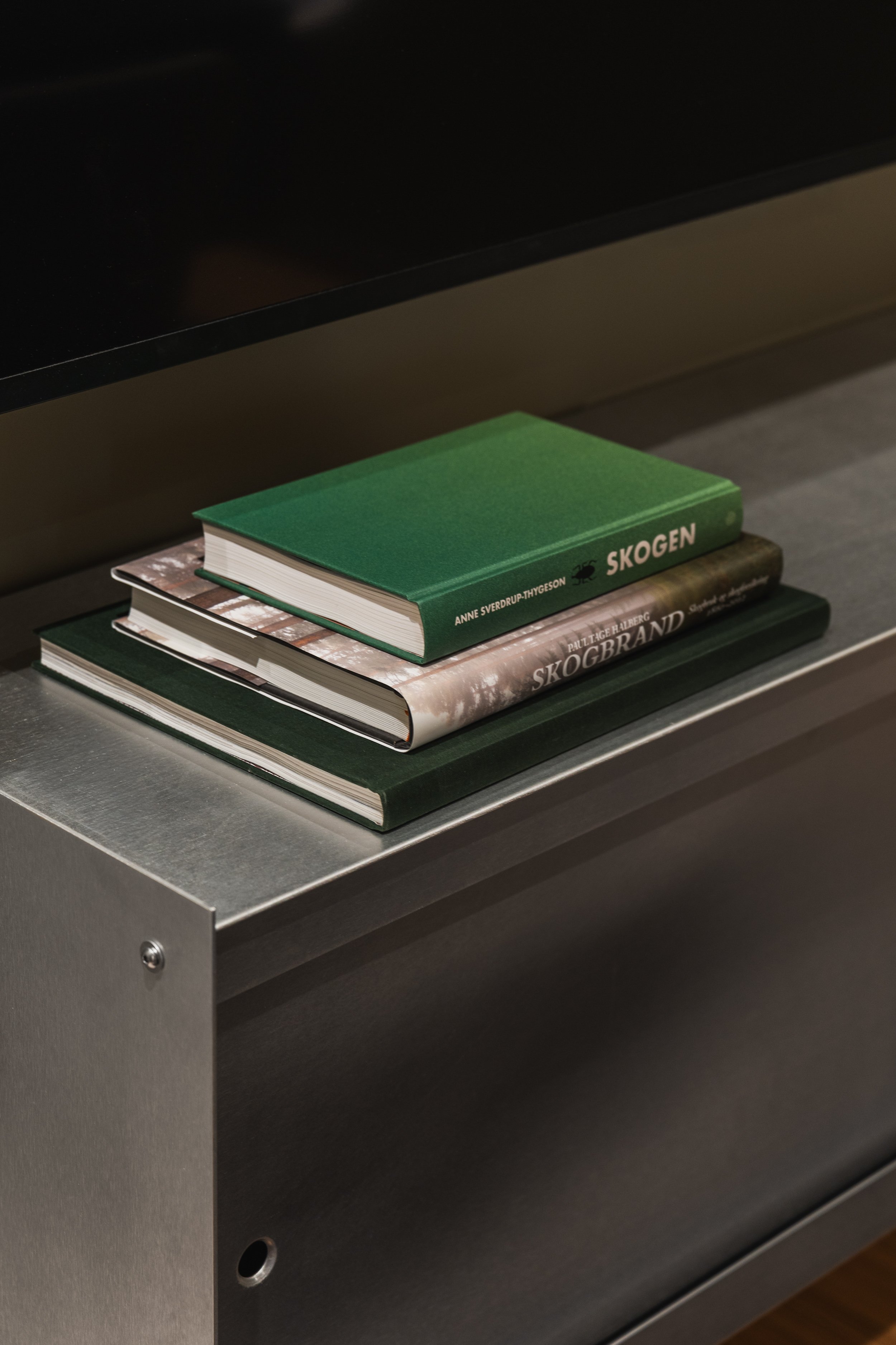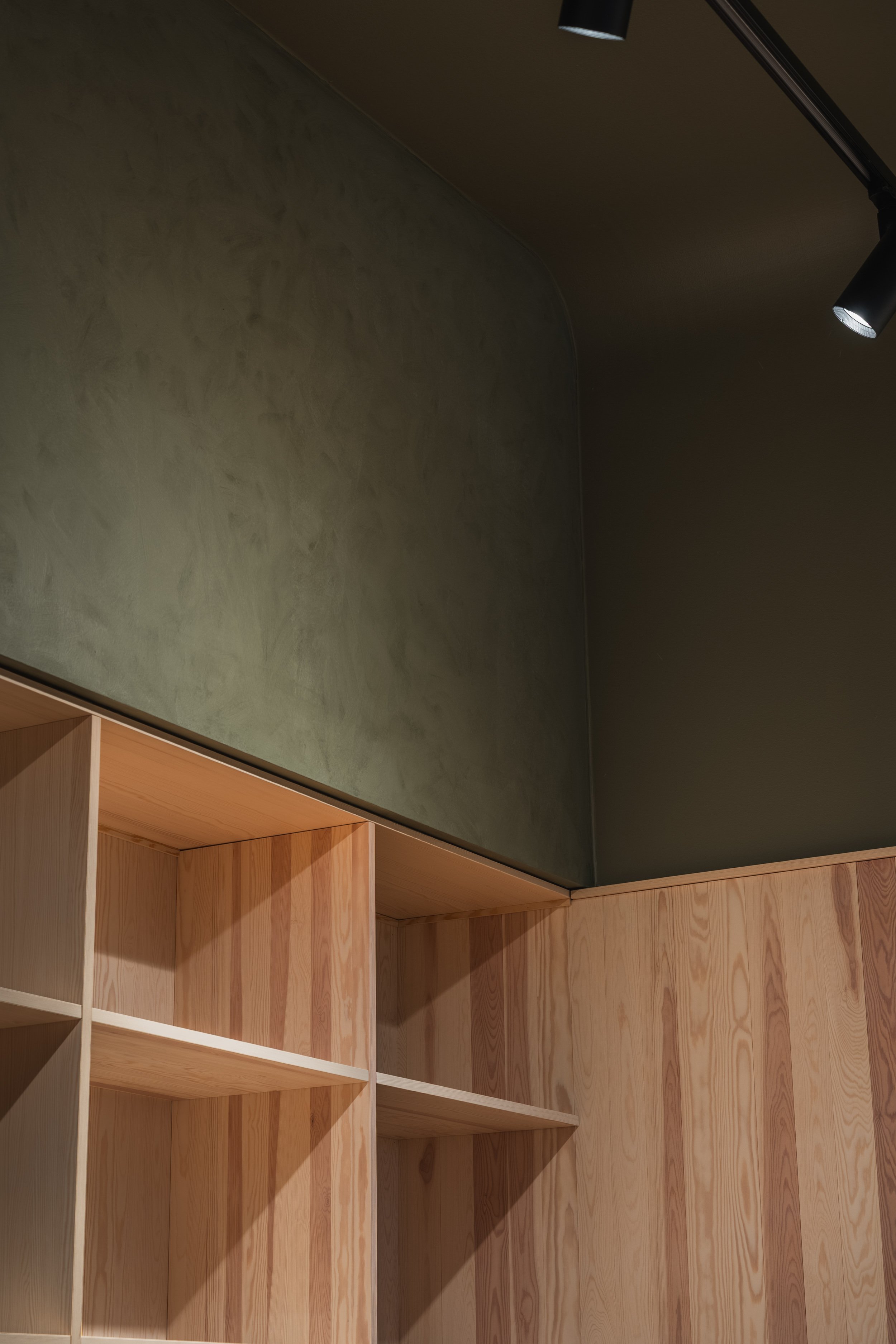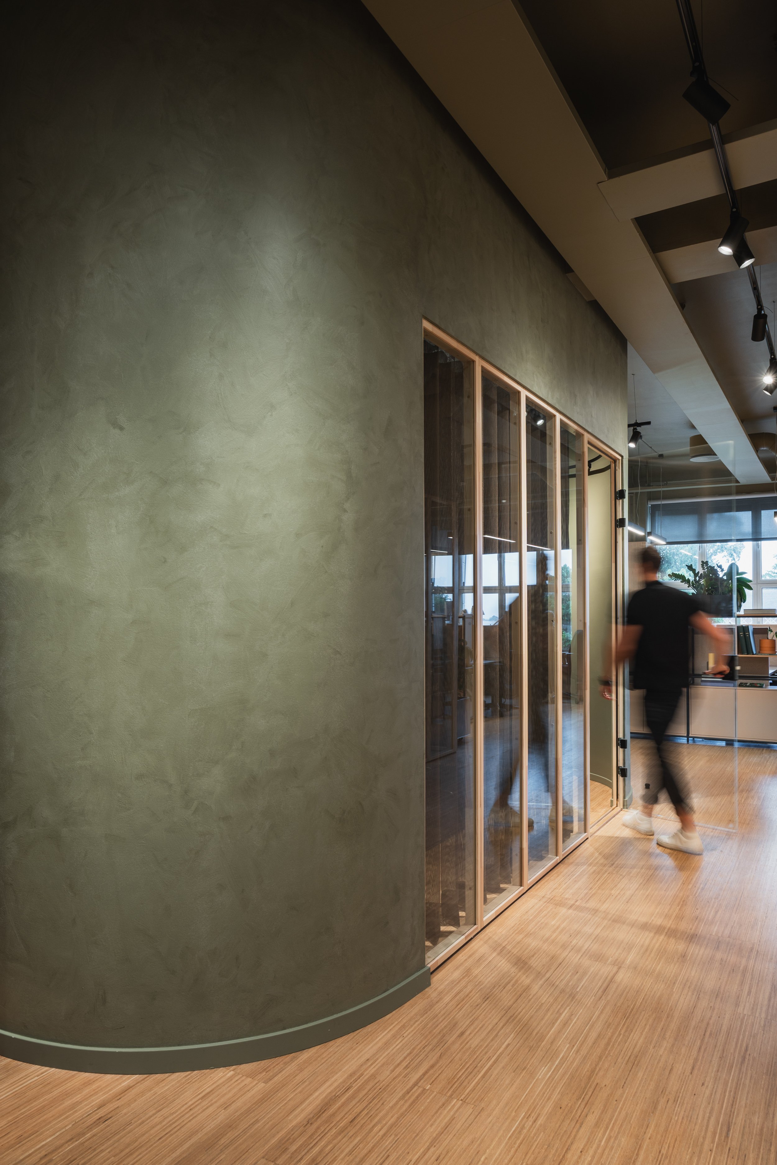 Fargepaletten er hentet fra naturen, med nyanser av mosegrønt, barkbrunt og dyp blågrå som speiler skoglandskapet og fjorden utenfor. Tonene skaper ro og balanse i rommene og danner en helhetlig ramme for arbeid og samhandling.