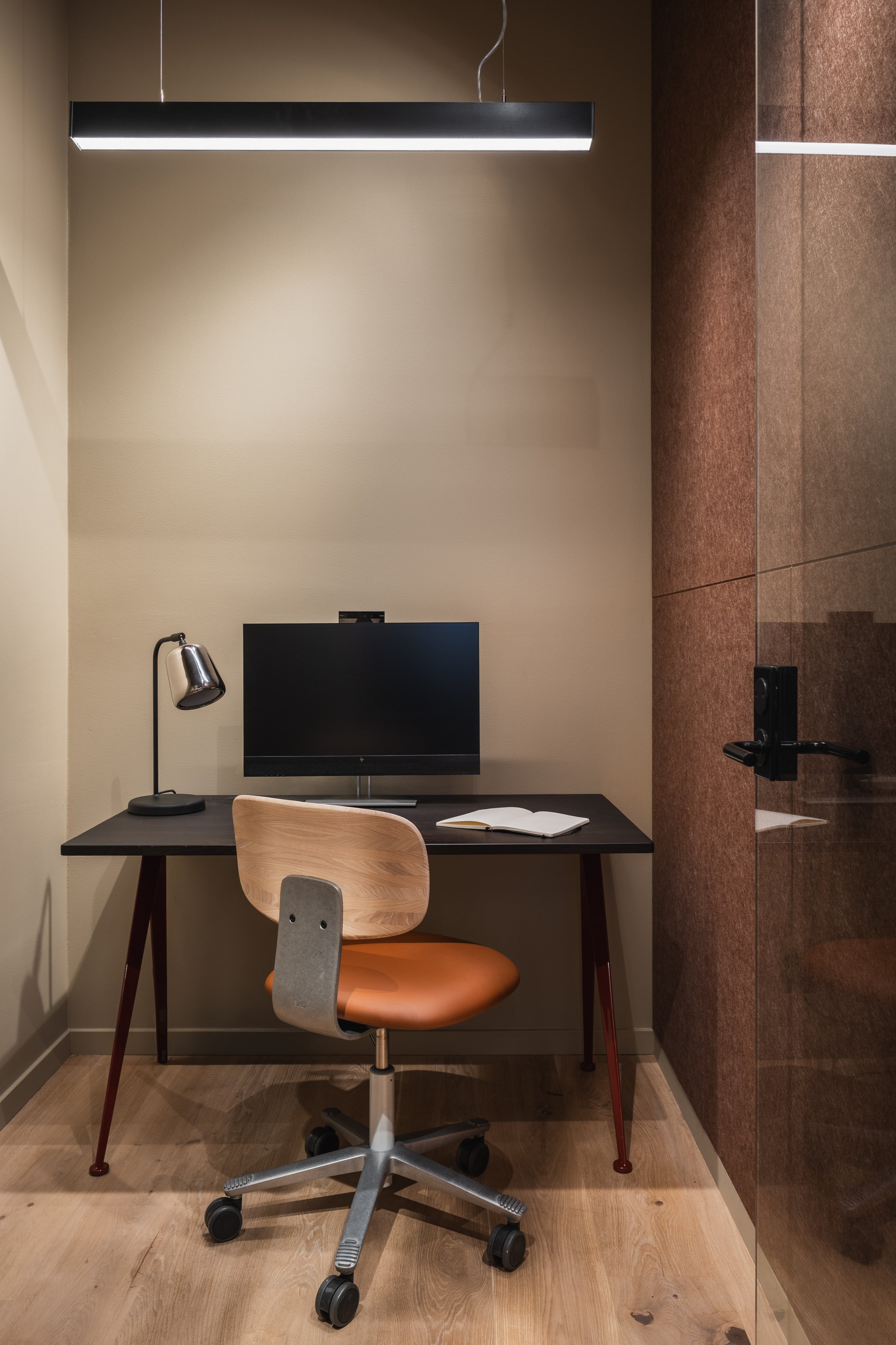 Sagbruket er et konsentrert arbeidsområde med naturlige materialer, grønntoner og gode ergonomiske løsninger som fremmer fokus.