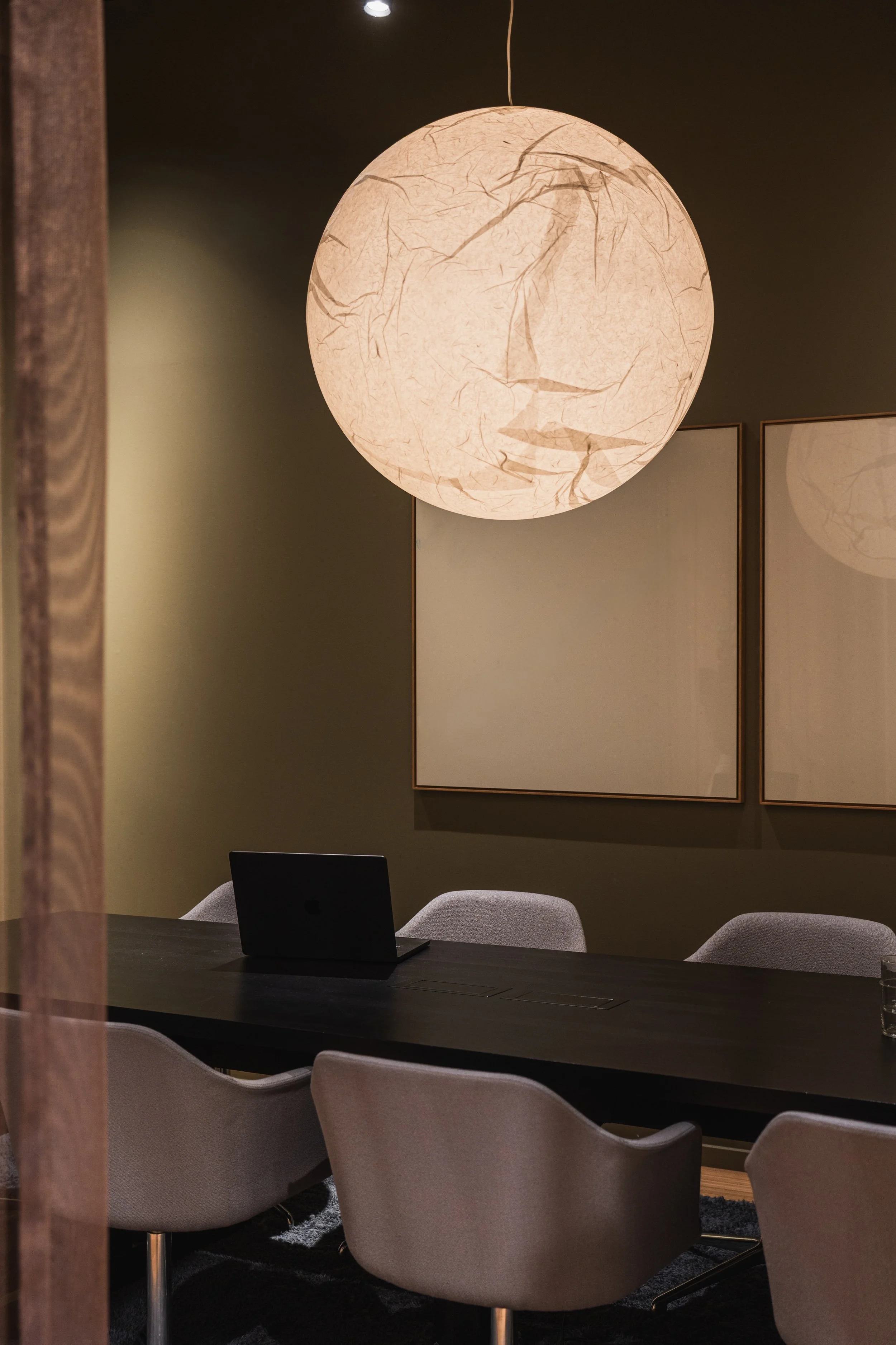 Belysningen kombinerer funksjon med stemning. Naturlig dagslys får strømme inn gjennom store vindusflater som åpner bygget mot omgivelsene og gir utsikt til tretopper og fjordlandskap. På kveldstid skaper varm, indirekte belysning et lunt og konsentrert arbeidsmiljø, samtidig som treverkets overflater fremheves. Over møtebordet henger papirlampen the Moon.