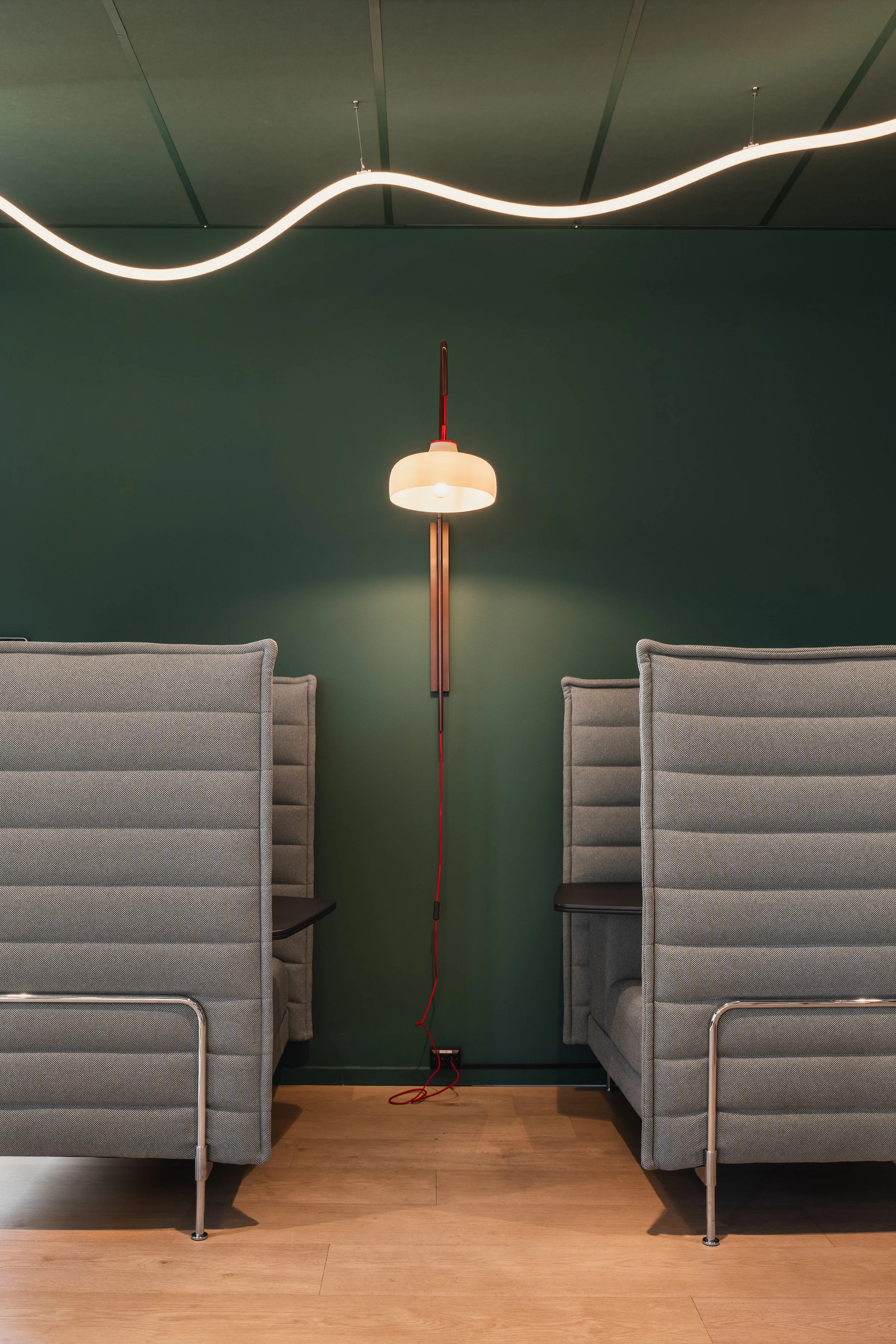 Vi ønsket å skape et åpent og inviterende samlingspunkt. Organiske former og lekne detaljer tilfører varme og energi, mens bølgende takbelysning symboliserer bevegelse og fremdrift. Resultatet er et kontor som både formidler merkevaren og gir plass til møter, samarbeid og fellesskap.